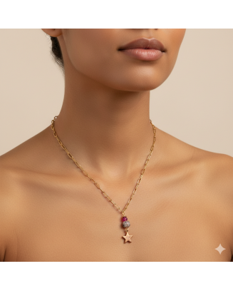 Collar con cadena de acero, con granates de entre 0,5 y 0,7 cm y pieza de acero inoxidable grabada.